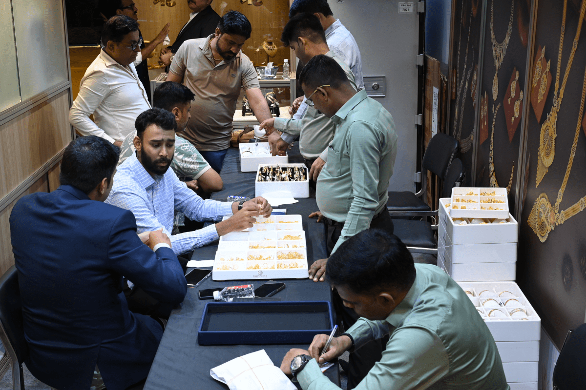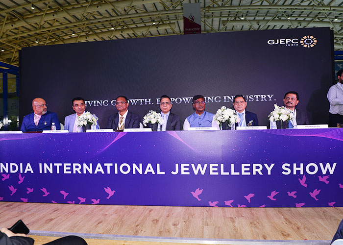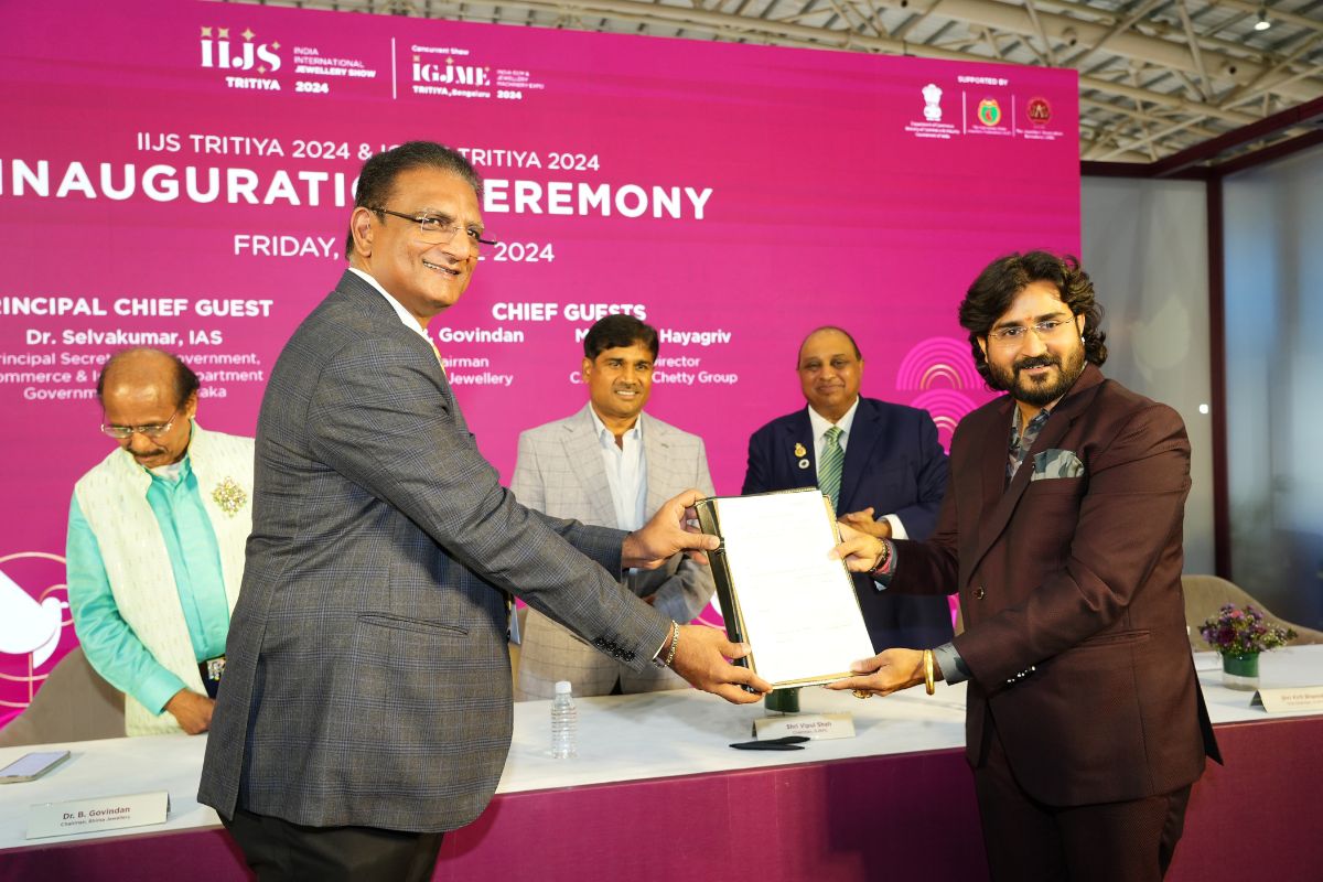 Mr. Sabhyasachi Ray - Executive Director, GJEPC, Mr. Nirav Bhansali - Convener, National Exhibitions - GJEPC, Dr. B. Govindan - Chairman, Bhima Jewellery, ... Dr. Selvakumar, IAS - Principal Secretary to Government, Commerce & Industries Department, Government of Karnataka, Mr. Vipul Shah - Chairman, GJEPC, Mr. Vinod Hayagriv - MD & Director, C. Krishniah Chetty Group, Mr. Kirit Bhansali - Vice Chairman, GJEPC, Dr. Chetan Kumar Mehta - National Vice President, IBJA and President, The Jeweller's Association Bangalore unveiling the Visitor Guide of IIJS Tritiya 2024 Read More