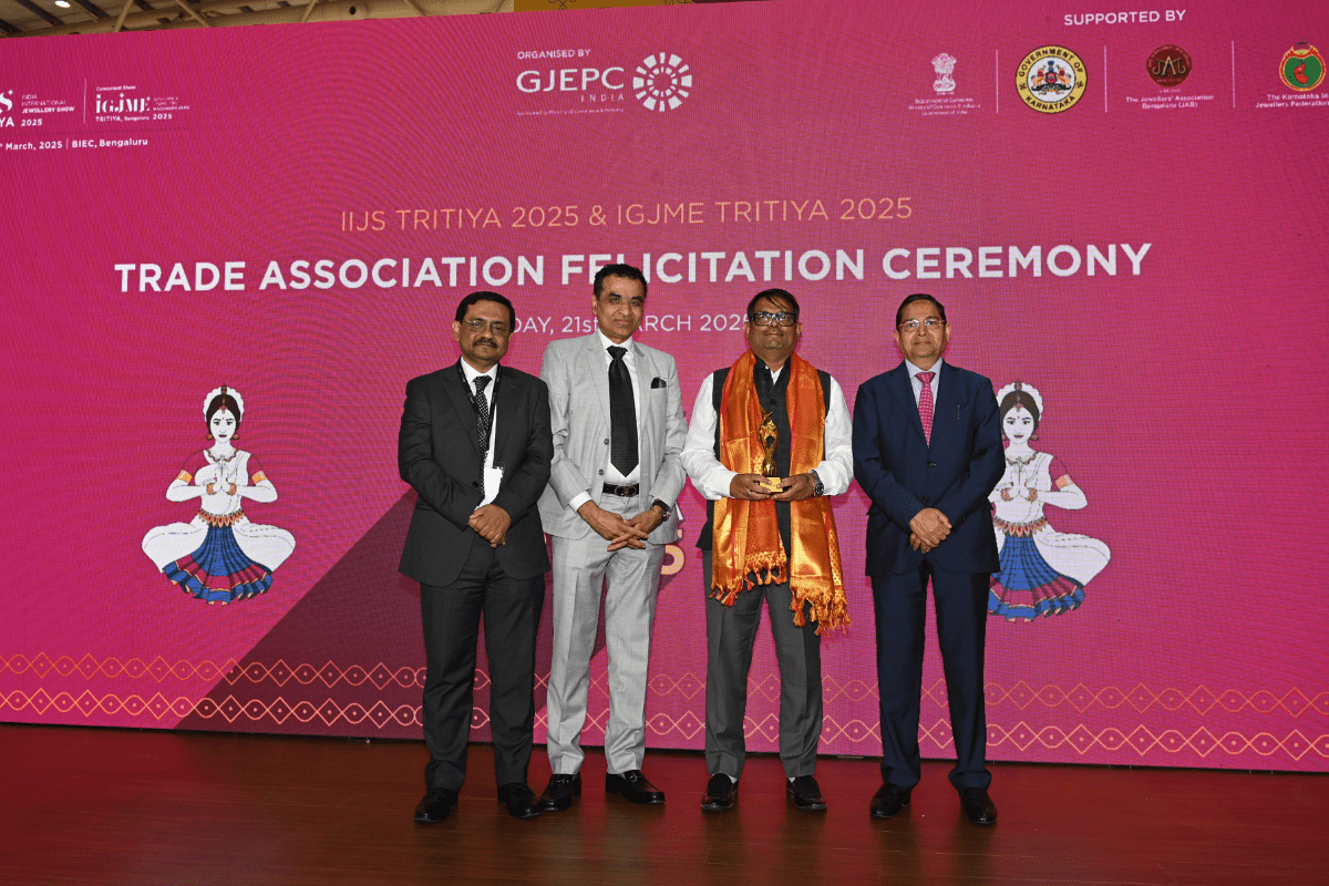 Mr. Kirit Bhansali - Vice Chairman, GJEPC, Mr. Vipul Shah - Chairman, GJEPC, Mr. Nirav Bhansali - Convener, National Exhibitions - GJEPC, Mr. Sabhyasachi Ray - Executive Director, GJEPC felicitating Dr. Chetan Kumar Mehta - National Vice President, IBJA and President, The Jeweller's Association Bangalore