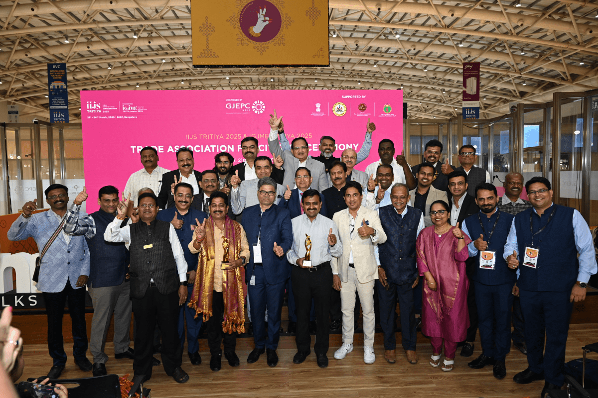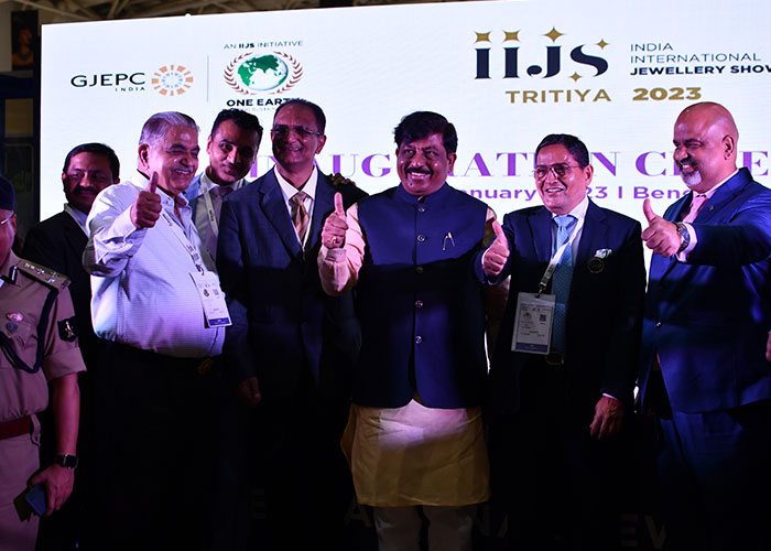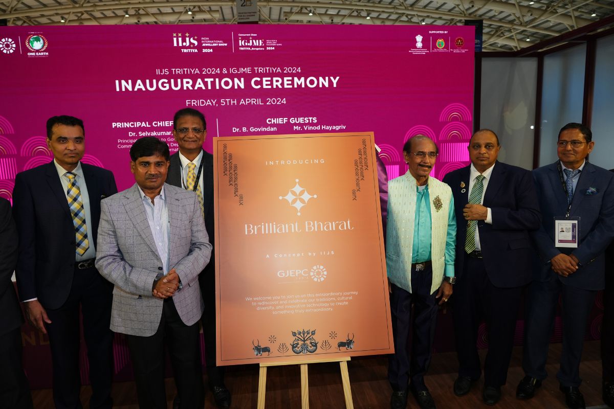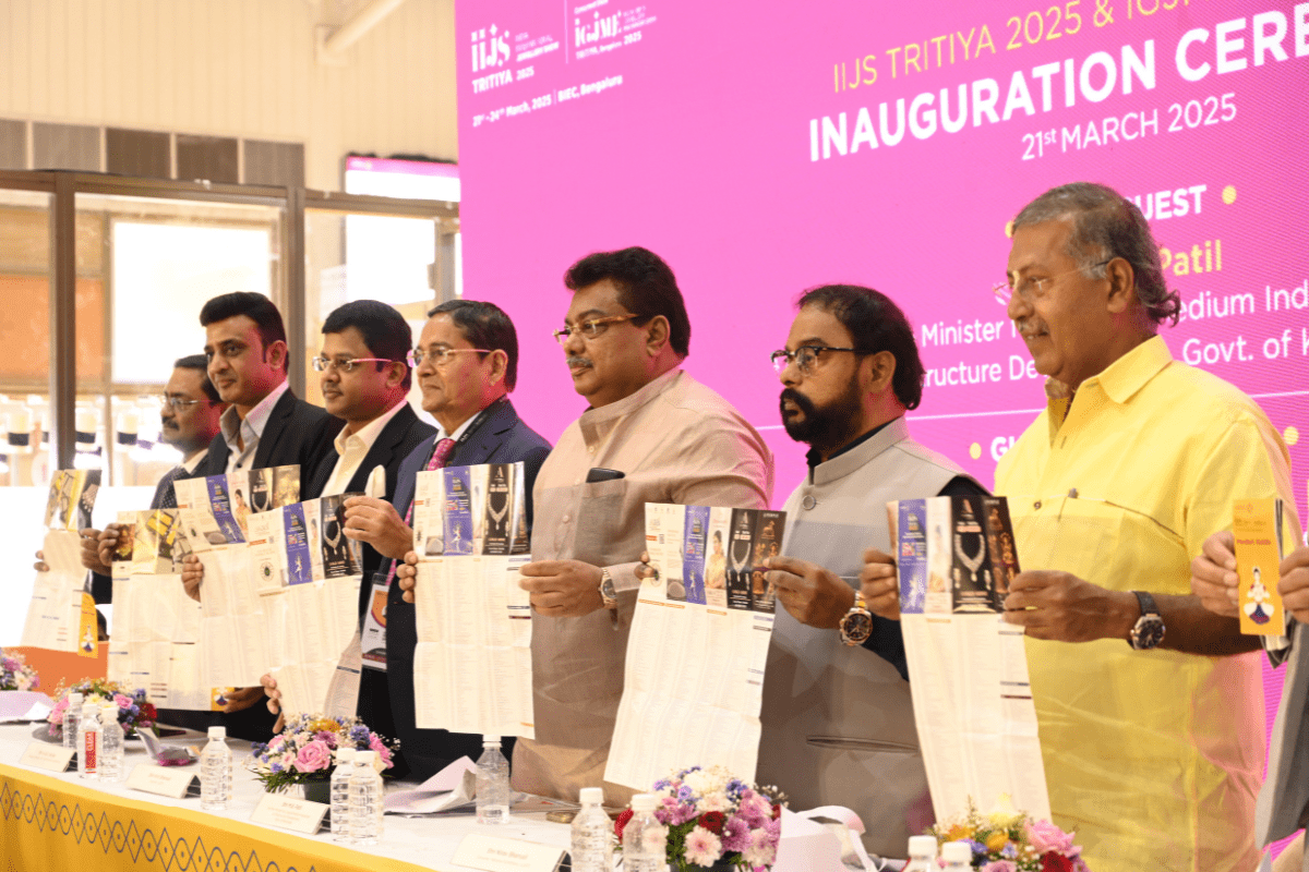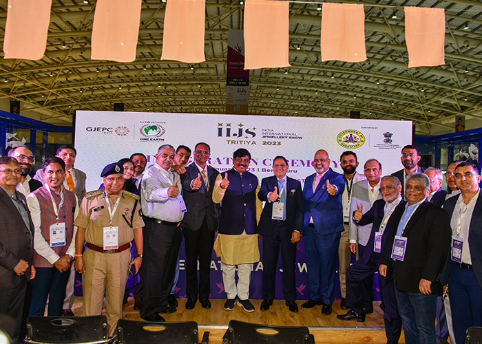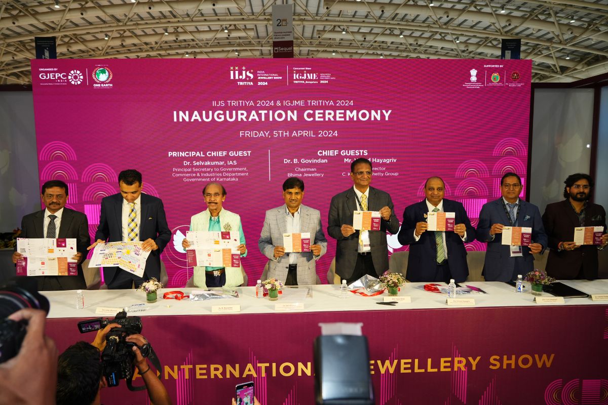 Mr. Sabhyasachi Ray - Executive Director, GJEPC, Mr. Nirav Bhansali - Convener, National Exhibitions - GJEPC, Dr. B. Govindan - Chairman, Bhima Jewellery, ... Dr. Selvakumar, IAS - Principal Secretary to Government, Commerce & Industries Department, Government of Karnataka, Mr. Vipul Shah - Chairman, GJEPC, Mr. Vinod Hayagriv - MD & Director, C. Krishniah Chetty Group, Mr. Kirit Bhansali - Vice Chairman, GJEPC, Dr. Chetan Kumar Mehta - National Vice President, IBJA and President, The Jeweller's Association Bangalore unveiling the Visitor Guide of IIJS Tritiya 2024 Read More
