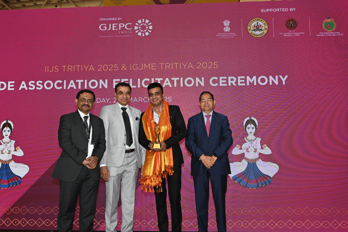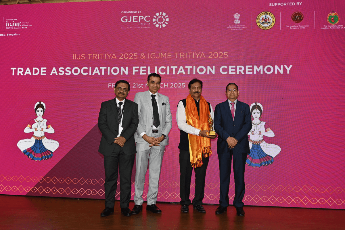 Mr. Kirit Bhansali - Vice Chairman, GJEPC, Mr. Vipul Shah - Chairman, GJEPC, Mr. Nirav Bhansali - Convener, National Exhibitions - GJEPC, Mr. Sabhyasachi Ray - Executive Director, GJEPC felicitating Dr. Chetan Kumar Mehta - National Vice President, IBJA and President, The Jeweller's Association Bangalore